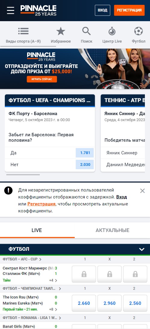 При открытии мобильной версии букмекерская контора «Пинакл» уже производит положительное впечатление, так как для игроков представлен знакомый дизайн сайта в бело-синих тонах. На главной странице представлена вся актуальная информация о событиях, которые транслируются на данный момент на площадке, а также баннеры с бонусной программой в онлайн-казино. В правом верхнем углу представлены две клавиши: «регистрация» и «вход», а в контекстной вкладке меню слева расположены остальные разделы: